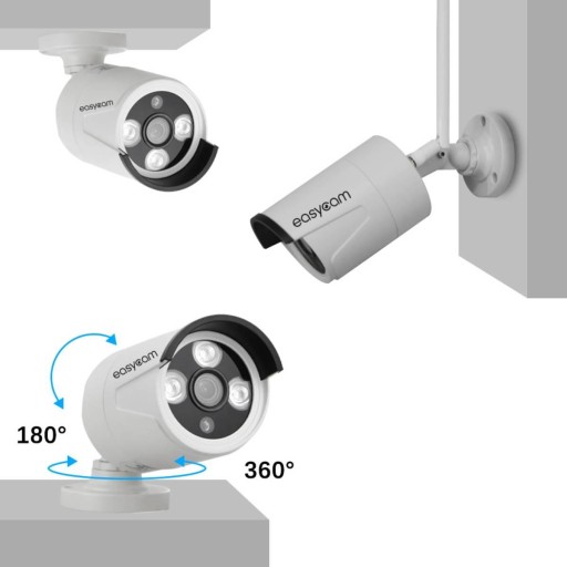 Kamery z zestawu EasyCam Wi-Fi Kit/NVR4CH/4-3T3IR posiadają 3-osiowy wspornik montażowy. Dzięki czemu posiadają możliwość montażu na: