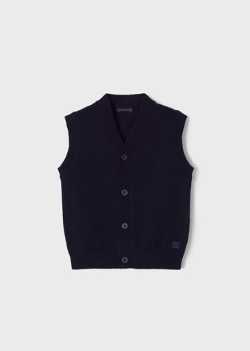 Kamizelka bez rękawków dla chłopca. Dekolt w serek. Zapięcie na środku na guziki. Model gładki. Skład: 60% Bawełna 30% Poliamid 10% Wełna