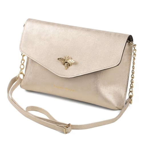 Koperta zapinana jest ozdobną pszczółką, dzięki której zyskuje na swoim eleganckim wyglądzie. Można ją nosić zarówno w ręce, jak i na ramieniu. Do torebki dołączono pasek ze złotym łańcuszkiem dodający elegancji. Gwarantujemy trwałość i wysoką jakość produktu. Gorąco polecam.