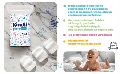• Miękkość i bezpieczeństwo: Płatki wykonane są w 100% z bawełny i mają miękkie brzegi. Płatki Kindii Pure nie pozostawiają włókien i chronią delikatną skórę dziecka. Ich miękkość zapewnia przyjemne uczucie podczas codziennej pielęgnacji.