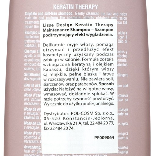 Delikatnie myje włosy i wspomaga utrzymanie w czasie efektów kosmetycznych uzyskanych podczas zabiegu prostowania keratynowego. Formuła wzbogacona Keratyną i olejkiem Babassù sprawia, że włosy są miękkie, dające łatwo się rozczesywać i pełne blasku.
