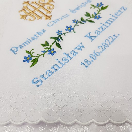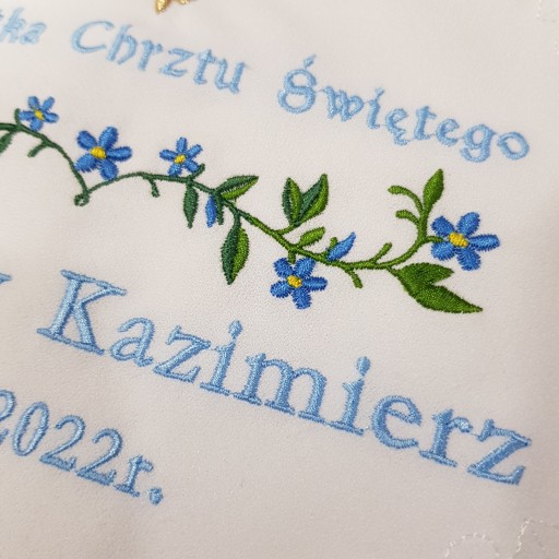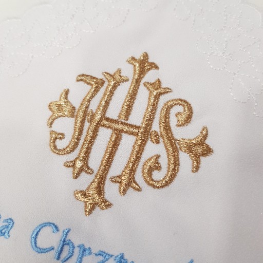 Wszystkie haftowane elementy są personalizowane - można sobie wybrać kolory nici poszczególnych elementów, imiona, datę. Na życzenie klienta możemy jeszcze dodatkowo zamienić znak "IHS" na Krzyżyk, Aniołka bądź parzenicę :)