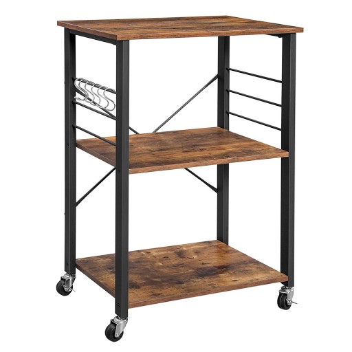 Bardzo praktyczny wózek na kółkach ułatwi Ci organizację naczyń w kuchni. Składa się z trzech otwartych półek i kilku wieszaków z boku. Wózek świetnie nadaje się do przechowywania różnego rodzaju naczyń, przypraw, olejów i sprzętów AGD.