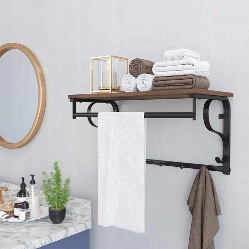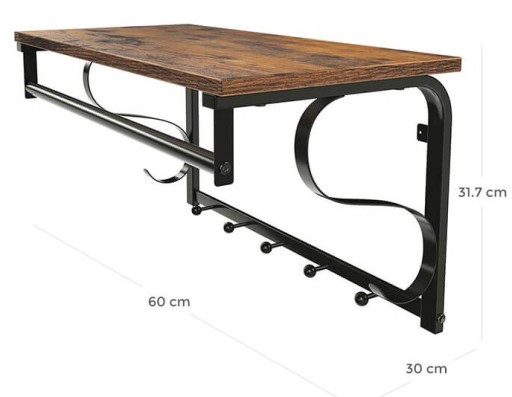 Półka ścienna może zamienić pustą ścianę w użyteczną i uroczą przestrzeń, dzięki której Twoje płaszcze, torby, klucze, a nawet ręczniki będą uporządkowane i pod ręką. Duża półka, drążek na wieszaki i 5 haczyków zaspokoją Twoje potrzeby, wykorzystując minimalną przestrzeń. Metalowa rama zapewnia solidne i stabilne podparcie. Rustykalna drewniana półka z czarną metalową ramą nada Twojej przestrzeni industrialny szyk.