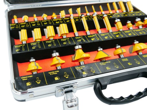 - Zestaw znajduje się walizce, każdy z frezów ma swoje podpisane miejsce.