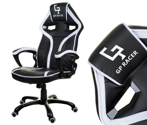 Obrotowy, nowoczesny fotel dla gracza Giosedio GP Racer wykonany ze skóry ekologicznej oraz z tkaniny membranowej. Fotel wyróżnia efektowna lakierowana podstawa i podłokietniki.