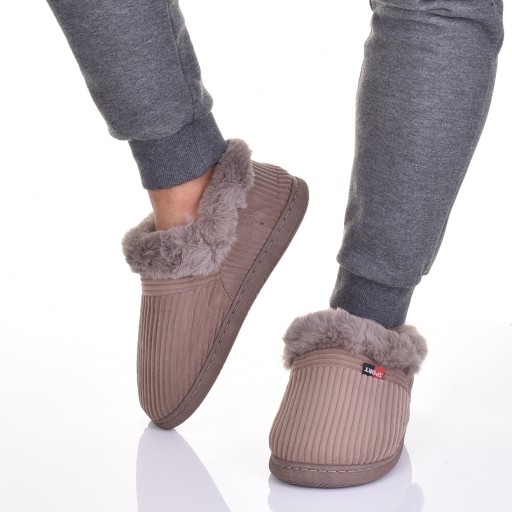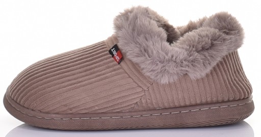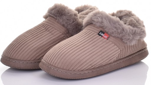 Kapcie całe zakryte, wsuwane, wykonane z bardzo miękkiego i ciepłego materiału - sztruksu z gęstym, ozdobnym futerkiem wokół kostki.