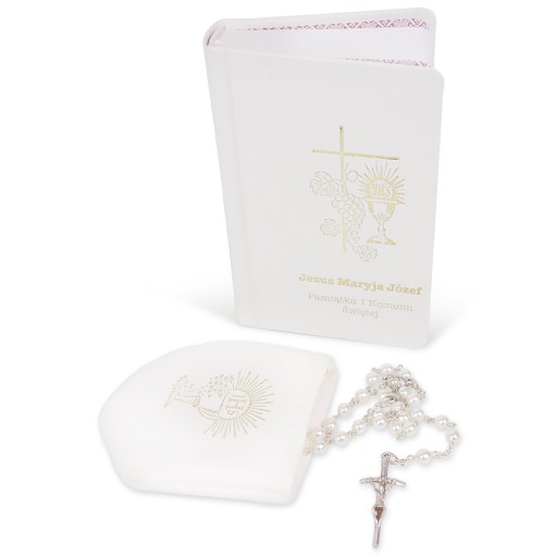 Zestaw komunijny dla dziewczynki lub chłopca: różaniec + etui + modlitewnik