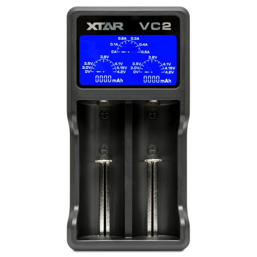 VC2 to profesjonalna procesorowa ładowarka z trzystopniowym procesem ładowania TC/CC/CV i wyświetlaczem LCD. Ładuje 1-2 ogniwa Li-ion 3,6 / 3,7V o dowolnej pojemności w rozmiarach 10440, 14500, 14650, 16340, 17500, 17670, 18350, 18500, 18650, 18700, 20700, 21700 - tylko niezabezpieczone, 22650, 25500, 26650.