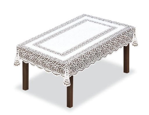 Oferta dotyczy obrusu prostokątnego żakardowego w kolorze białym, obrus w bogaty wzór pięknie podkreśli kształt stołu.