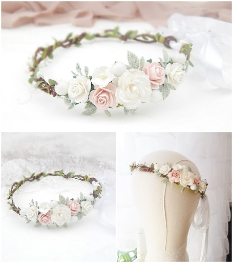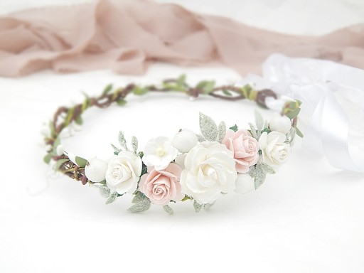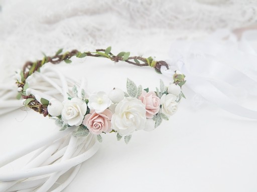Wyjątkowy wianuszek zdobiony delikatnymi biało różowymi różyczkami z dodatkiem zielonych gałązek. Wianuszek regulowany obwód ok.50-52 cm, wiązany z tyłu koronkową i satynową tasiemką.