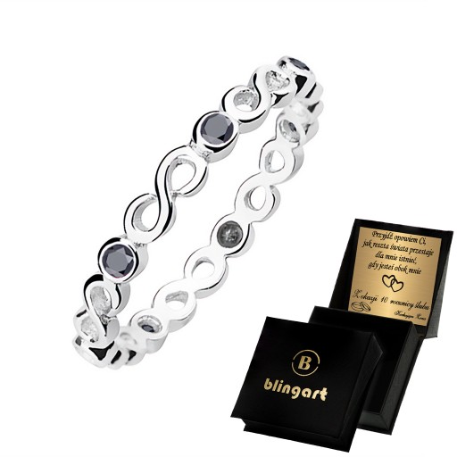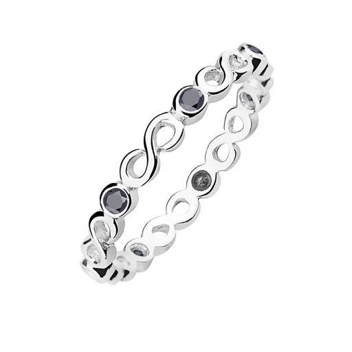 Pierścionek srebrny damski wykonany został z najwyższej jakości srebra próby 925. Obręcz pierścionka stanowią połączone ze sobą znaki nieskończoności inaczej nazywane lemniskatą. Ten znak kiedyś był przeznaczony dla uczonych jednak w obecnym czasie ma symboliczne znaczenie zwłaszcza w kręgu najbliższych sobie osób. Może on wyrażać naszą stałość i niezmienność w uczuciach a nawet świadczyć o naszym oddaniu dla drugiej osoby. Znak nieskończoności przeplata się naprzemiennie z czarnymi cyrkoniami tworząc tym samym spójną kompozycję. Biżuteria została poddana rodowaniu dzięki czemu zyskała blasku i stała się odporna na zarysowania.
