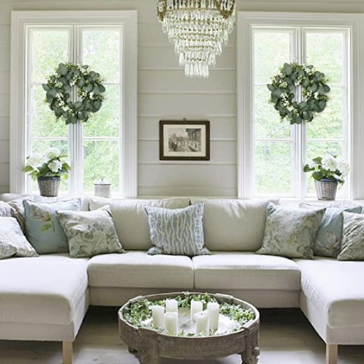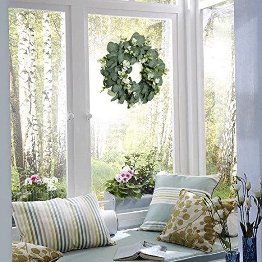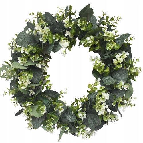 Zielony wieniec/wianek z eukaliptusa jest pokryty drobnymi białymi kwiatami.