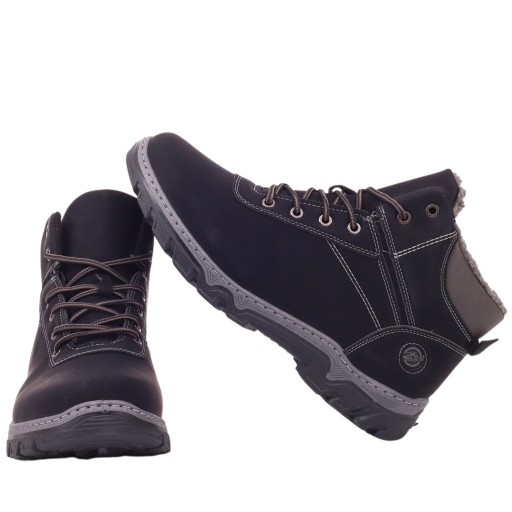 Buty męskie zimowe ocieplane, w kolorze czarne wykonane ze świetnej jakości materiałów. Wiązanie na sznurówki oraz zapinanie na suwak reguluje tęgość obuwia. Wysoka cholewka zapewnia stabilizację. Podeszwa jest szyta i klejona co zapewnia długą wytrzymałość. W całości jest ocieplony mięciutkim futerkiem, doskonały na chłodniejsze dni. Antypoślizgowa podeszwa z bieżnikiem poprawia amortyzację stopy.
