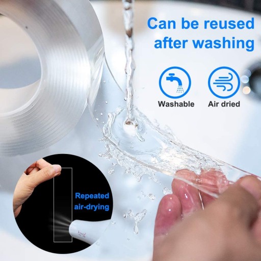 • Dwustronny mocny żel nadający się do mycia i wielokrotnego użytku. (Taśma klejąca kiedy się zabrudzi, może zostać umyta wodą. Wystarczy umyć i osuszyć, aby przywrócić lepkość, a następnie ponownie użyć.