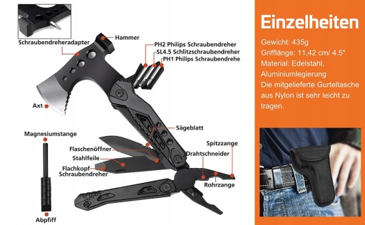 - 【15- IN-1-Mini Hammer】 To nie tylko młot, ale także jeden topór, a Szczypce, śrubokręt, noża druciane, ostry nóż, piła, postrzępiony nóż, plik, pręt magnezowy i gwizdek, to idealne narzędzie kieszonkowe, które spełnia wszystkie potrzeby twoich bliskich.