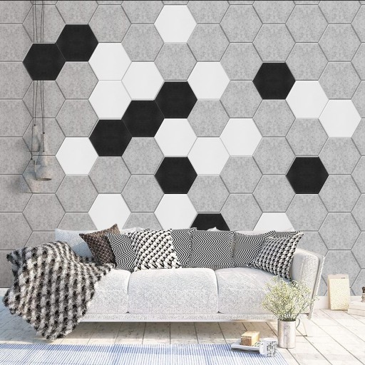 - Praktyczne i piękne. Gęstość wynosi do 230 kg/m3. Im wyższa gęstość, tym lepsza izolacja akustyczna i efekt redukcji hałasu. Grubość wynosi zaledwie 0,9 cm, co w ogóle nie zajmuje miejsca. Unikalna sześciokątna konstrukcja pozwala na idealne dopasowanie każdego elementu. Można go również wyciąć samodzielnie lub stworzyć kolaż z innymi kształtami.