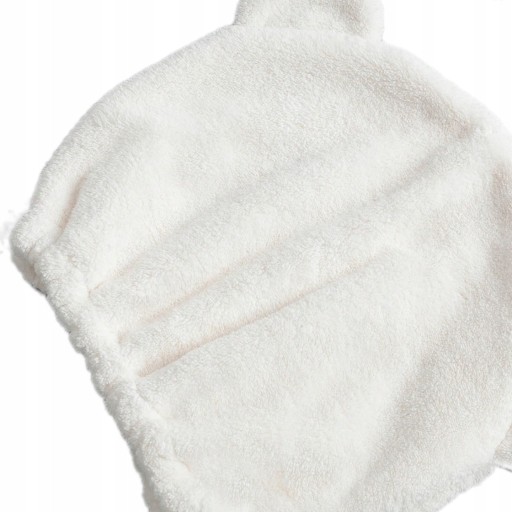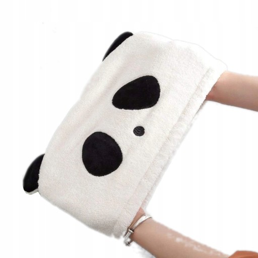 Specjalnie zaprojektowany kształt ręcznika ułatwia zakładanie go na włosy bez żadnego problemu. Dzięki zamocowanej gumce, która znajduje się na dole utrzymuje się na głowie. A kształt czepka i wzór wesołej białej pandy z czarnymi oczkami, przykuwają uwagę i przypadną do gustu zarówno dzieciom, jak i dorosłym.