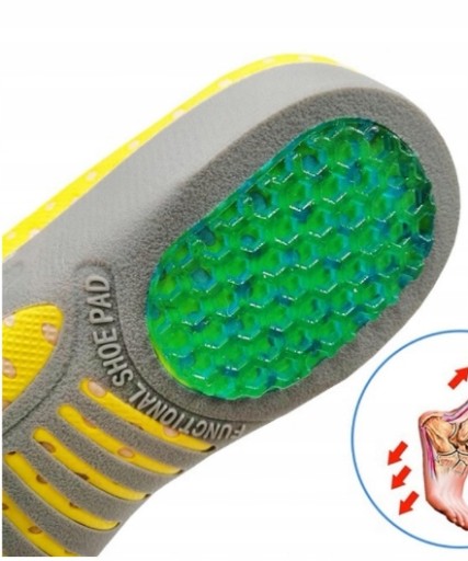 - Żelowa wkładka absorbująca wstrząsy, oraz odciążająca piętę (ostroga piętowa)