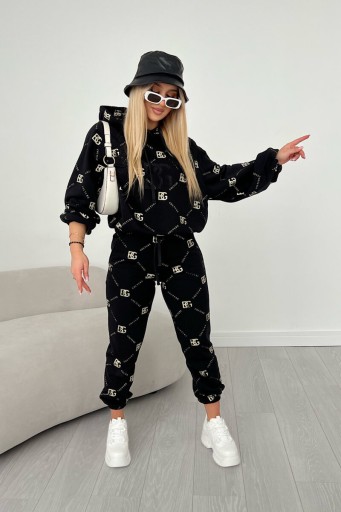 Komplet damski wykonany z wysokiej jakości bawełny (nieocieplanej) w kolorze czarnym. Dodatkowo ozdobny print na całym dresie w złotym kolorze. Na bluzie oraz spodniach ozdobne logo BG ułożone z kamieni ozdobnych, czarnych. Bluza posiada kaptur oraz sznurek w kapturze. Spodnie posiadają kieszenie oraz sznurek w pasie. Idealna propozycja na wiosnę.