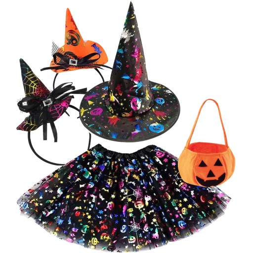 Zestaw składa się z spódniczki tutu 2- warstwowej, opaski czarnej, koszyczka na cukierki, kapelusza czarodzieja, opaski pomarańczowej.