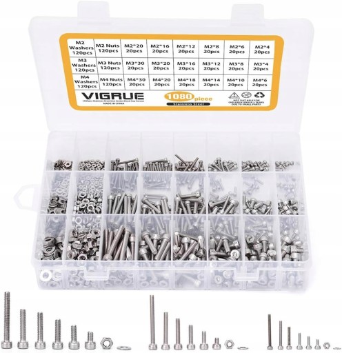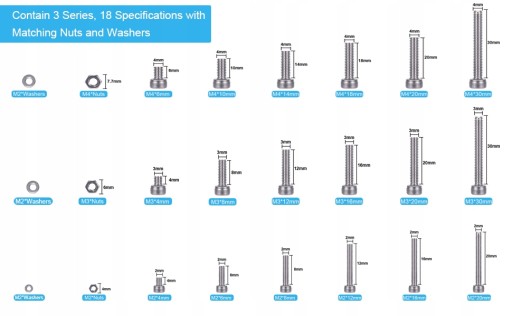 M4 x 6mm/10mm/14mm/18mm/20mm/30mm (20 sztuk każdego rozmiaru) z odpowiednią ilością podkładek i nakrętek, łącznie 1080 sztuk dla wszystkich różnych potrzeb.