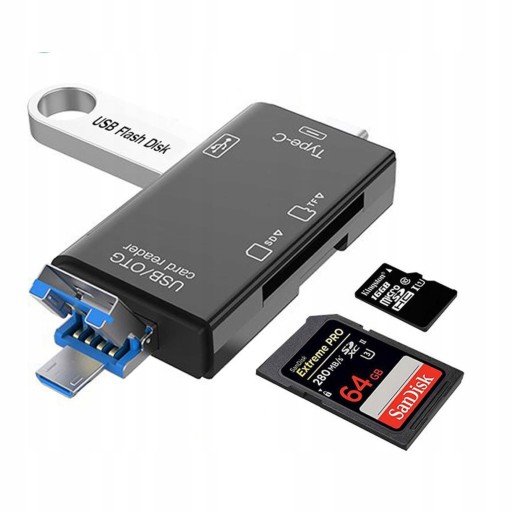 Wielofunkcyjny czytnik kart pamięci, pozwala podłączyć karty micro SD (małe), SD. Obsługuje duże pojemności aż do 128 GB. Posiada wyjścia na USB-C, klasyczne USB i micro USB. Wszystko to w poręcznej formie małego pendrive. Można go połączyć z komputerem, laptopem, smartfonami i innymi urządzeniami mobilnymi. Niezastąpiony gadżet do przenoszenia danych pomiędzy najróżniejszymi urządzeniami. Dzięki 5 funkcjom: trzy wtyki USB i dwa porty na karty pamięci pozwala przenieść dane praktycznie z każdego urządzenia.