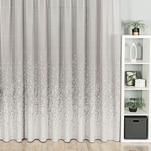 Firana w szarym kolorze została wykonana z grubego żakardu który dobrze osłoni okno, ale nie wprowadzi do wnętrza ponurej atmosfery. Taka dekoracja zachwyca swoim designem oraz nowoczesnym kolorem co sprawia, że firana przykuje każde spojrzenie i z pewnością nigdy się nie znudzi. Jej wysokość pozwala na zawieszenie jej w zarówno w oknie balkonowym jak również tarasowym, gdyż idealnie będzie się komponować w dosłownie każdym wnętrzu.
