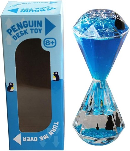 Oto niezwykły, oryginalny minutnik w formie eleganckiego kryształu. Klepsydra działa na zasadzie przelewania się cieczy z jednej do drugiej części klepsydry. Wewnątrz umieszczono dwa wesołe pingwinki które unoszą się na morskiej cieczy. Kropelki które przelewają się mają regularny kształt i tworzą piękne kropelkowe podłoże dla pingwina znajdującego się na dole. Odwróć klepsydrę, a zacznie ona odmierzać czas od nowa. Klepsydra będzie modną i ładną ozdobą pokoju dziecięcego. Idealna dla fanów wyjątkowych gadżetów.