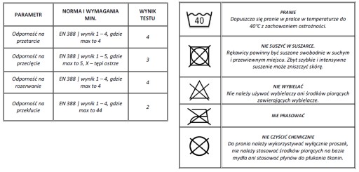 Rękawice te nie zapewniają ochrony przed czynnikami cieplnymi, chemicznymi, zagrożeniami bakteriologicznymi, prądem elektrycznym oraz ruchomymi i obrotowymi ostrzami. Uszkodzone rękawice nie zapewniają odpowiedniego poziomu ochrony i należy je natychmiast wymienić na nowe i wolne od wad.