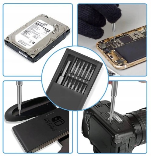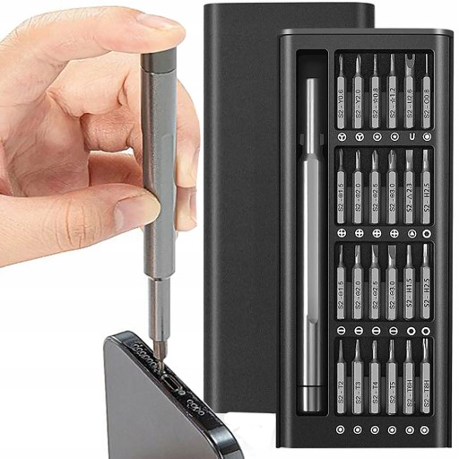Zestaw wkrętaków precyzyjnych składa się z 24 elementów, wykonanych z wysokiej jakości stali magnetycznej.