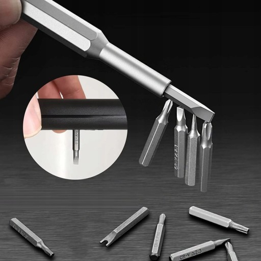 - ⭐ Dzięki bardzo małym rozmiarom zmieści się w każdej szufladzie, pudełku czy skrzynce na narzędzia. Nie musisz już mieć osobnego śrubokręta dla każdej końcówki.