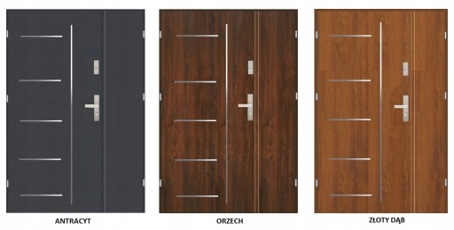 Drzwi wykończone są wysokogatunkową okleiną drewnopodobną PCV odporną na działanie promieni UV. Zabezpieczenie stanowią dwa zamki trzy bolcowe oraz bolce przeciwwyważeniowe od strony zawiasów