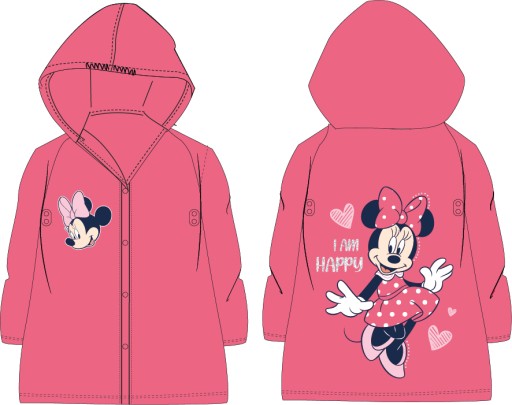 Świetna pelerynka - PŁASZ przeciwdeszczowy z motywem z bajki MINNIE. Lekka, wygodna, zapewnia pewną ochronę przed deszczem. Zapinana na 4 zatrzaski. Nadruk znajduje się z przodu i z tyłu pelerynki, a pod pachami są otwory zapewniające idealną cyrkulację powietrza. Kaptur posiada wszyty ściągacz z przodu, który świetnie sprawdza się na wietrzne dni. Płaszcz wykonany z trwałego i przyjemnego w dotyku materiału PCV.