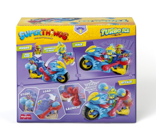 Jedenasta seria Super Zingsów stworzona pod nazwą Neon Power to postacie ulepszone, niespotykane i niesamowicie pożądane przez wszystkich małych kolekcjonerów. W najnowszym zestawie umieszczono zupełną nowość: znajdziesz tu fantastyczny i superszybki motocykl w kolorze niebieskim - oto Turbo Ice! Pojazd wyposażony jest w wyrzutnię kulek lodowych oraz miejsce dla dwóch bohaterów. W zestawie znajdziesz figurkę Kazoom Kida - Bandilla Ice Biker oraz ekskluzywnego Super Thinga - Mad Cone. Zbierz całą kolekcję.