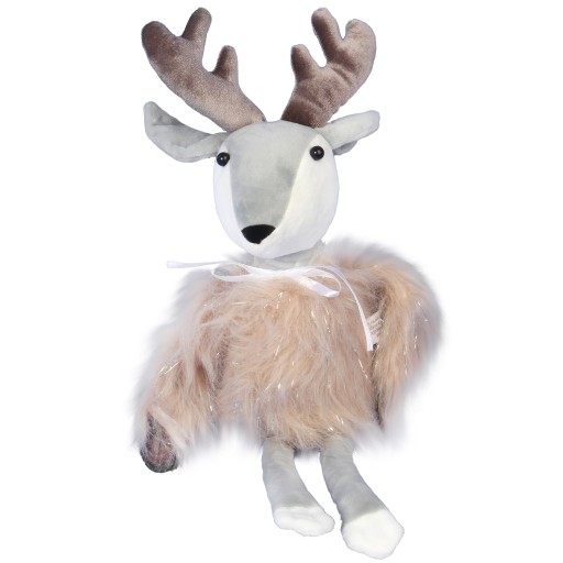 RENIFER SIEDZĄCY ZE ZWISAJĄCYMI NOGAMI Figurka wykonana z wysokiej jakości materiałów, przyjemna w dotyku. Idealna do posadzenia w salonie świątecznym, pod choinką lub na kominku.