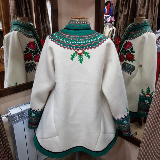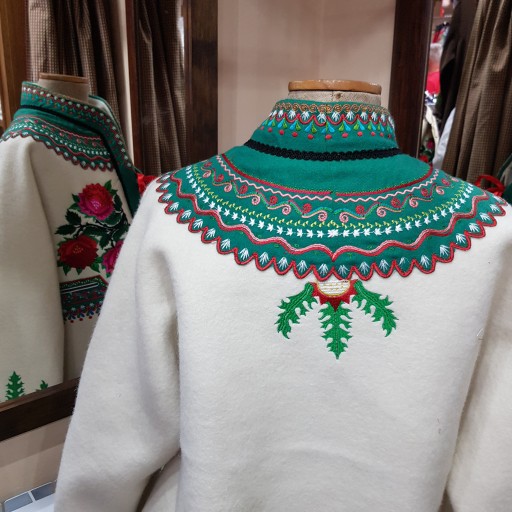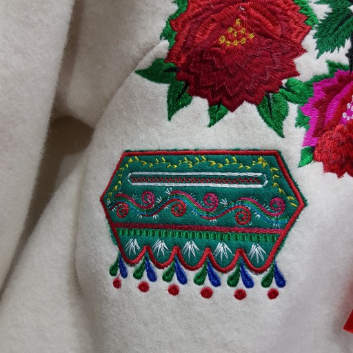 Haft przedstawia tradycyjne elementy góralskie, jest bogaty oraz gęsty. Kolory nici są żywe, nie ulegają wypłowieniu ani nie puszczają koloru podczas prania czy czyszczenia. Został tak zaprojektowany aby wyglądał na ręczny
