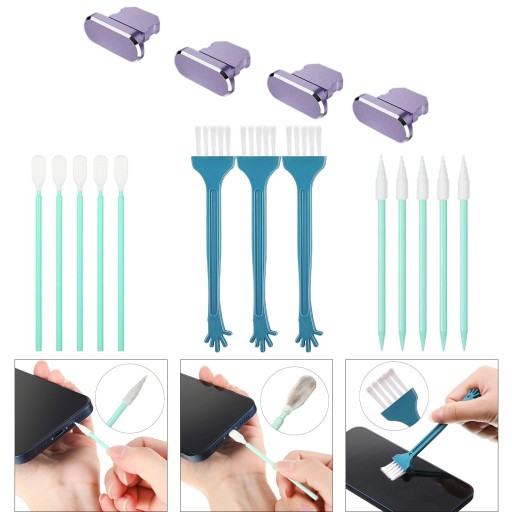 Zawartość opakowania: 4 x metalowe zatyczki przeciwkurzowe do telefonu, 3 x szczoteczka do czyszczenia głośników telefonu, 10 x waciki Kompleksowy zestaw, który spełni Twoje wymagania dotyczące czyszczenia telefonu