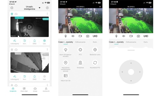 - Obracanie kamery przy pomocy przycisków w aplikacji (PTZ)