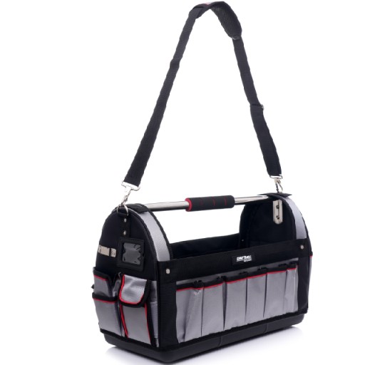 - Sztywne dno pokryte kompozytowym tworzywem zapewnia trwałość, a wiele kieszeni porządek oraz szybki dostęp do potrzebnych narzędzi.