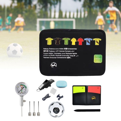 Profesjonalny zestaw akcesoriów dla sędziego piłkarskiego: zawiera gwizdek, manometr, ołówek i torbę do przechowywania itp.