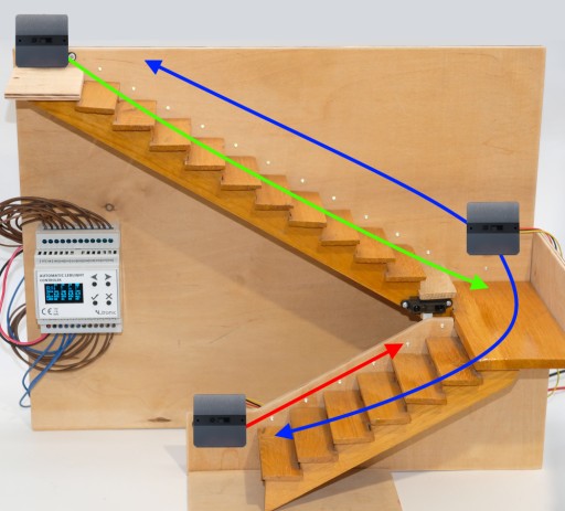 W przypadku pojedynczych schodów wystarczą nam dwie czujki ruchu i możemy sterować kierunkiem rozświetlania świateł na schodach.