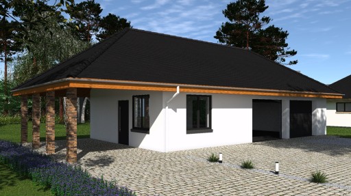 Utrzymany w kolorystyce nowoczesnego designu z tradycyjnymi elementami widocznej więźby dachowej garaż z pewnością wpasuje się do każdego rodzaju krajobrazu i zabudowy.