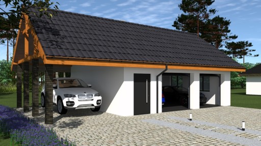 Przykryty dachem dwuspadowym budynek posiada prostą zwartą bryłę łatwą i tanią w budowie i użytkowaniu. Do budynku z lewej strony przylega wiata, przykryta przedłużeniem dachu głównego garażu. Utrzymany w kolorystyce nowoczesnego designu z tradycyjnymi elementami widocznej więźby dachowej garaż z pewnością wpasuje się do każdego rodzaju krajobrazu i zabudowy. Na frontowej ścianie garażu umieszczono dwie bramy garażowe oraz dodatkowe drzwi wejściowe do części gospodarczej garażu. Wnętrze stanowią dwa pomieszczenia. Pierwsze to niewielkie pomieszczenie gospodarcze mogące służyć do przechowywania narzędzi ogrodowych lub jako kącik do majsterkowania. Drugie to naturalnie doświetlony garaż z dwoma stanowiskami postojowymi w którym nie zabrakło miejsca na regały służące do przechowywania niezbędnych przy użytkowaniu auta akcesoriów oraz mniejszych narzędzi. Wiata może stanowić dodatkowe miejsce do parkowania lub być zadaszeniem do przechowywania.