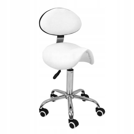 Ergonomiczny taboret kosmetyczny w kolorze białym z profilowanym siedziskiem w kształcie siodła to produkt, który dba o stan twoich stawów i kręgosłupa wymuszając prawidłową postawę ciała podczas pracy. Wyprofilowane siedzisko pozwala na wielogodzinna pracę bez dyskomfortu.