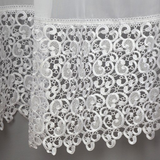 Lambrekin pięknie wykończony gipiurą oraz białą lamówką. Wszyta taśma marszcząca z tunelem pozwala na zawieszenie firany bezpośrednio na karniszu rurkowym czy na żabkach. Firana wygląda elegancko, doskonale sprawdza się w każdym pomieszczeniu, dodając uroku i elegancji.