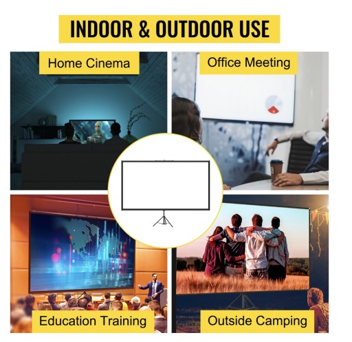Nasz przenośny ekran projekcyjny ma rozdzielczość 16:9 4K HD i kąt widzenia 160 stopni, zapewniając wyraźny i żywy obraz. Będziesz cieszyć się pięknymi filmami, zdjęciami i grami oraz spędzać więcej czasu z rodziną i przyjaciółmi. Stojak ma regulowaną wysokość, aby spełnić różne potrzeby. Dzięki aluminiowemu statywowi i pozbawionej zmarszczek powierzchni poliestrowej ten ekran wideo idealnie nadaje się do kina domowego, sal konferencyjnych, wesel, a nawet na zewnątrz, np. na kempingu lub podczas wieczorów filmowych na podwórku.