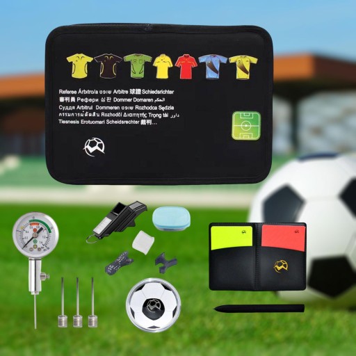 Profesjonalny zestaw akcesoriów dla sędziego piłkarskiego: zawiera gwizdek, manometr, ołówek i torbę do przechowywania itp.