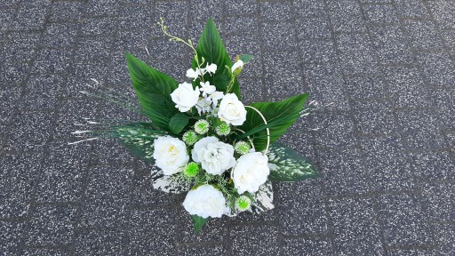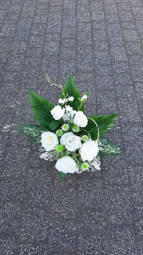 - wykonany ze sztucznych róż i storczyków oraz liści i tkaniny dekoracyjnej