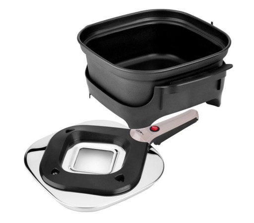 To praktyczne urządzenie posiada nieprzywierającą teflonową powłokę oraz praktyczny kwadratowy kształt. Pokrywa wykonana ze stali nierdzewnej, posiada otwory wentylacyjne oraz szklane okienko. Nie musisz już podnosić całej pokrywy aby zobaczyć na jakim etapie przygotowań jest Twój danie, wystarczy zajrzeć przez szybę! Bezpieczeństwo w użytkowaniu zapewnia specjalna blokada, która wyłącza urządzenie w chwili zdejmowania z niego pokrywy (nawet wtedy, gdy przycisk na pokrywie jest włączony!). Zarówno stabilny stojak oraz uchwyty są izolowane – dzięki temu bez problemu przeniesiesz oraz postawisz gorące danie gdzie tylko zechcesz, bez konieczności przekładania go przy tym do kolejnego naczynia. Kolejnym praktycznym elementem jest długi przewód zasilający (1,5 m).